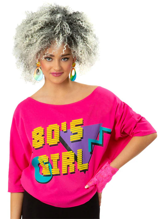 80's pink wide neck t-shirt with bat wing sleeves with '80's Girl'